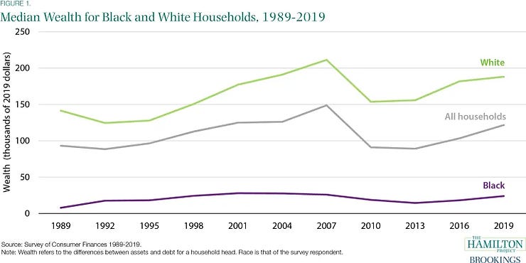 The racial wealth gap is both staggering and persistent. As illustrated in the graph below, the median wealth of White and Black households is $188,200 and $24,100. In other words, half of White families have a net worth of above $188,200 , while the other half possess a level of wealth that's less than that. The cutoff point for Black households is obviously much lower: 50% of Black households have a net worth that exceeds $24,000, while the other half's wealth level is less than $24,000. Thus, median White household is currently rocking a wealth level that's almost eight times that of the median Black household ($188,200/$24,100).